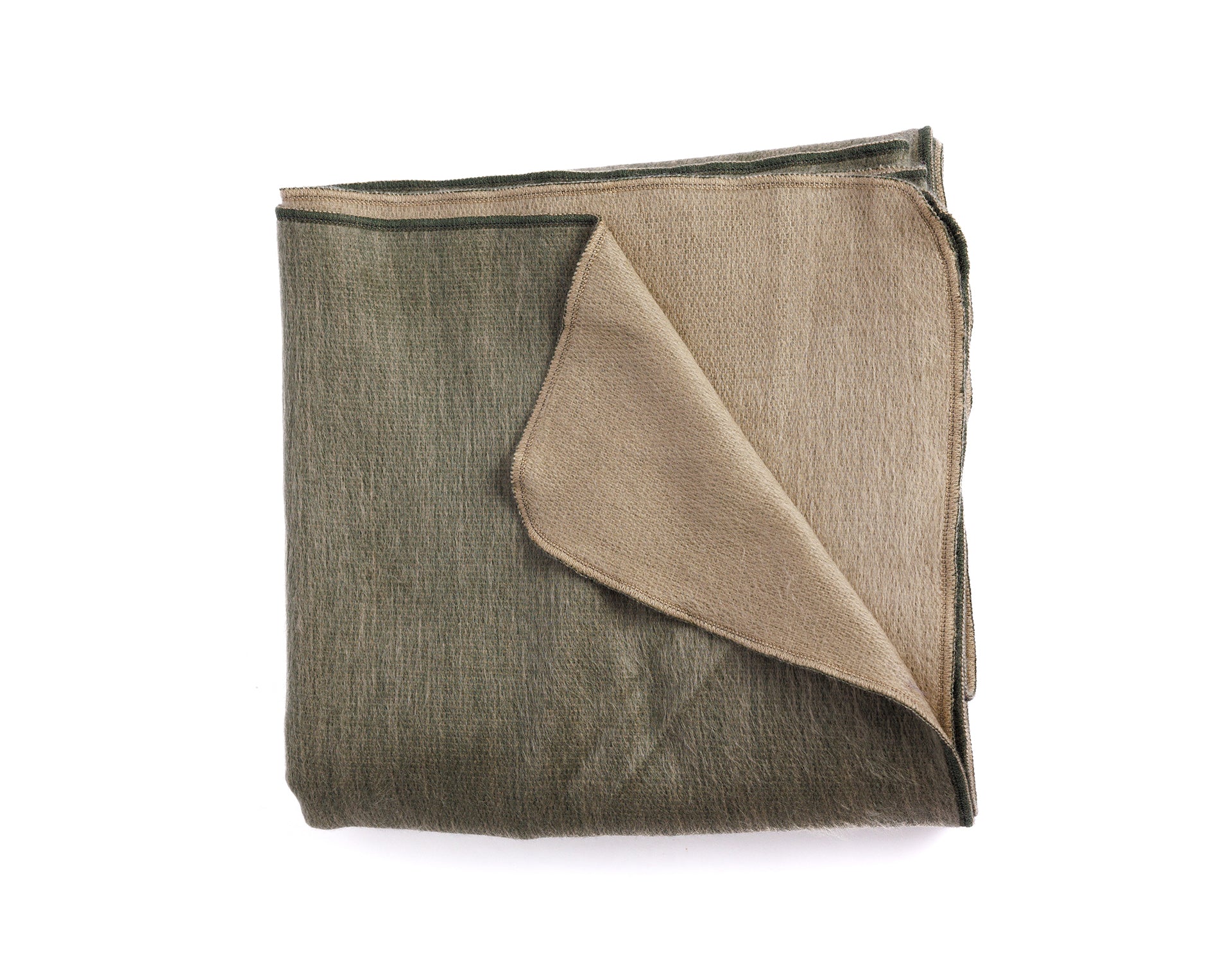 The reversible throw is woven such that the tobacco color is on one side and olive green on the other.