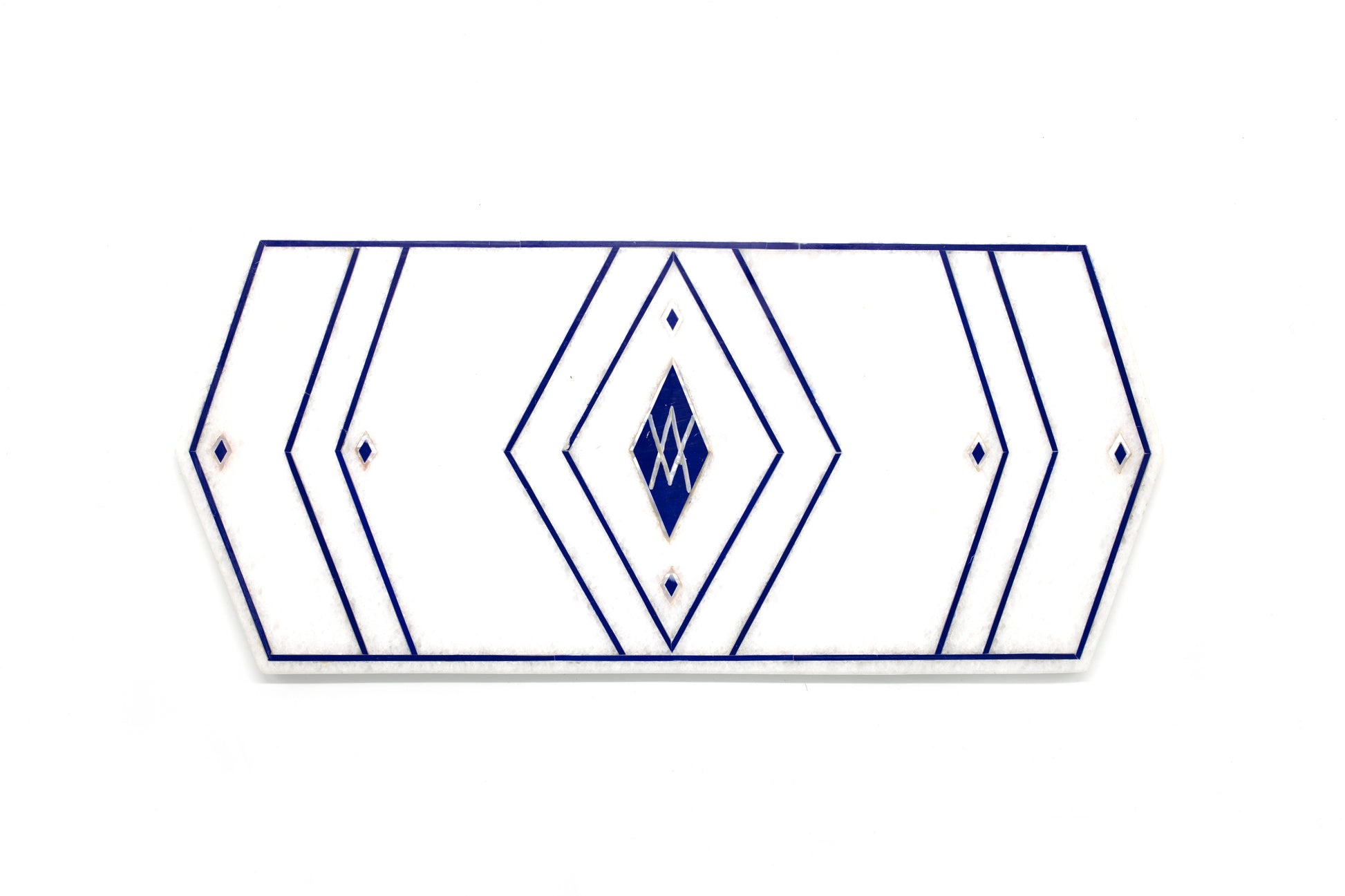 Designed exclusively by our Founder after visiting the Taj Mahal, this modern and unique lapis, mother of pearl, and marble tray is a beautiful serving piece or decorative accent tray. We work with artisans in Agra, India who carve out the marble and carefully inlay lapis stones and mother of pearl that form our unique geometric design. The artisans are so exact with fitting the inlaid stones that the surface is perfectly smooth to the touch and is food safe.